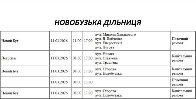 Графік відключення світла по адресах 11 березня, Новобузька дільниця АТ «Миколаївобленерго»