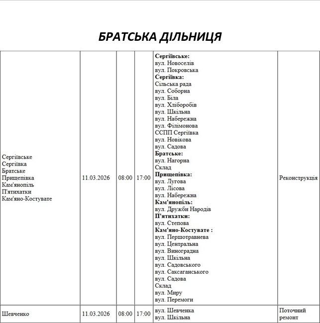 Графік відключення світла по адресах 11 березня, Братська дільниця АТ «Миколаївобленерго»
