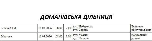 Графік відключення світла по адресах 11 березня, Доманівська дільниця АТ «Миколаївобленерго»