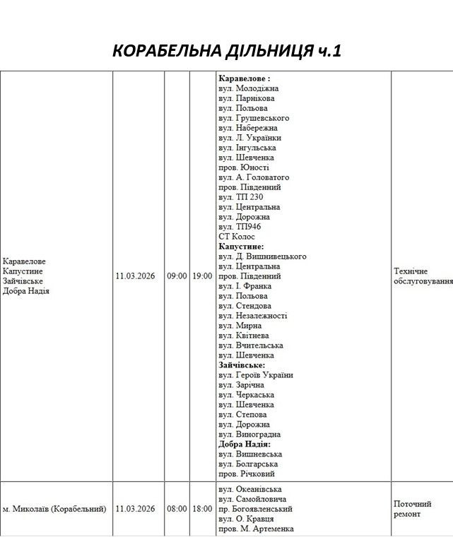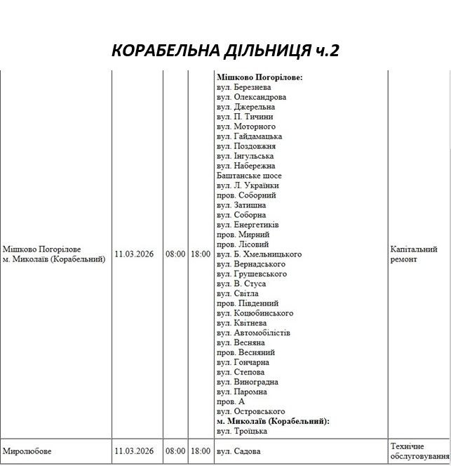 Графік відключення світла по адресах 11 березня, Корабельна дільниця АТ «Миколаївобленерго»