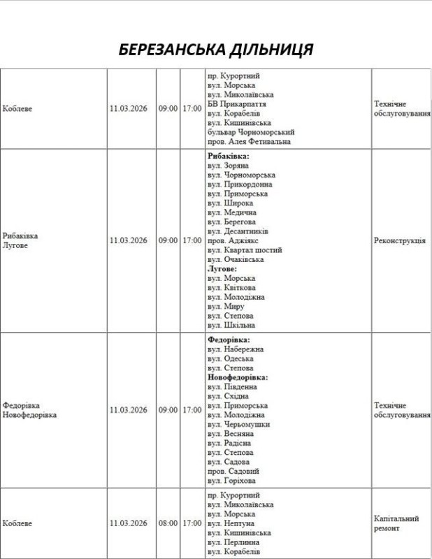 Графік відключення світла по адресах 11 березня, Березанська дільниця АТ «Миколаївобленерго»