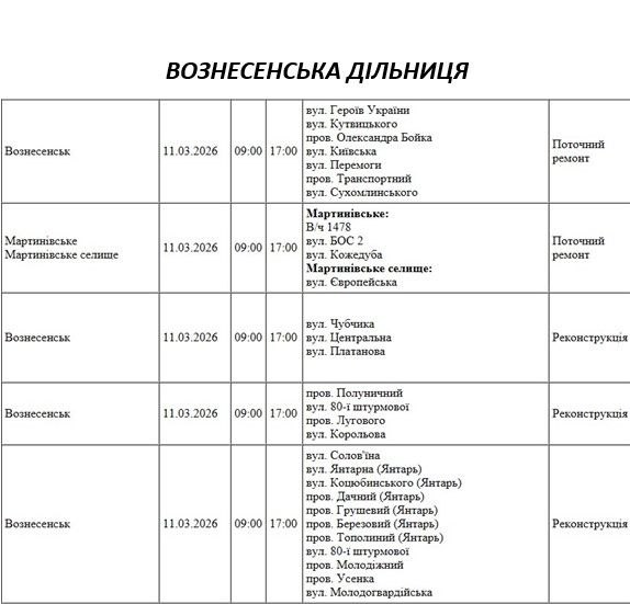 Графік відключення світла по адресах 11 березня, Вознесенська дільниця АТ «Миколаївобленерго»
