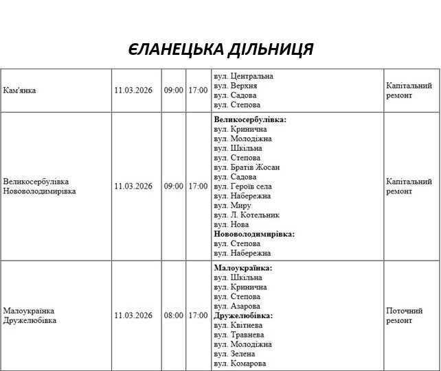 Графік відключення світла по адресах 11 березня, Єланецька дільниця АТ «Миколаївобленерго»