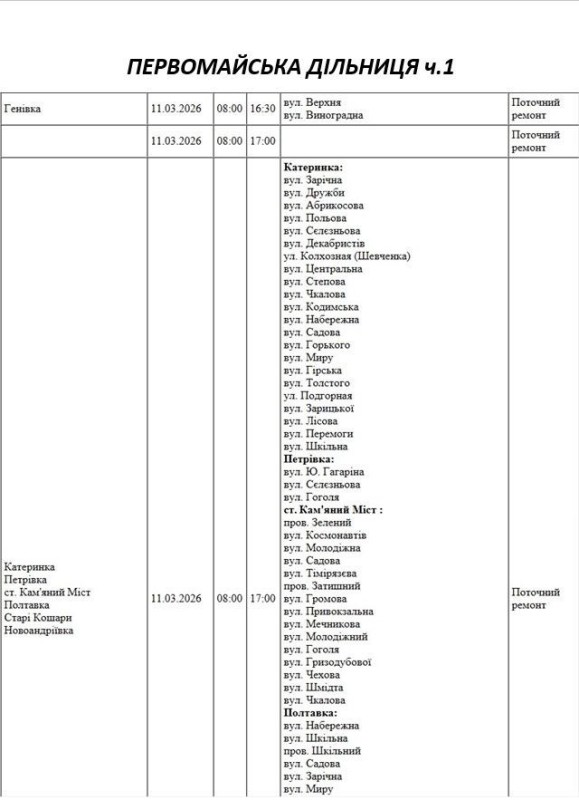 Графік відключення світла по адресах 11 березня, Баштанська дільниця АТ «Миколаївобленерго» Первомайська дільниця