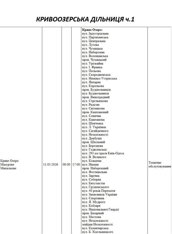 Графік відключення світла по адресах 11 березня, Кривоозерська дільниця АТ «Миколаївобленерго»