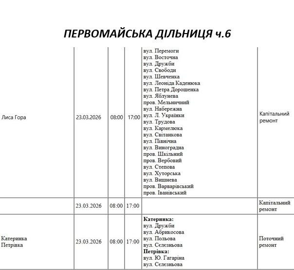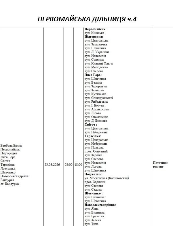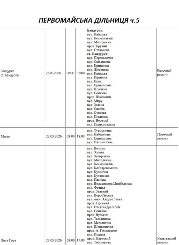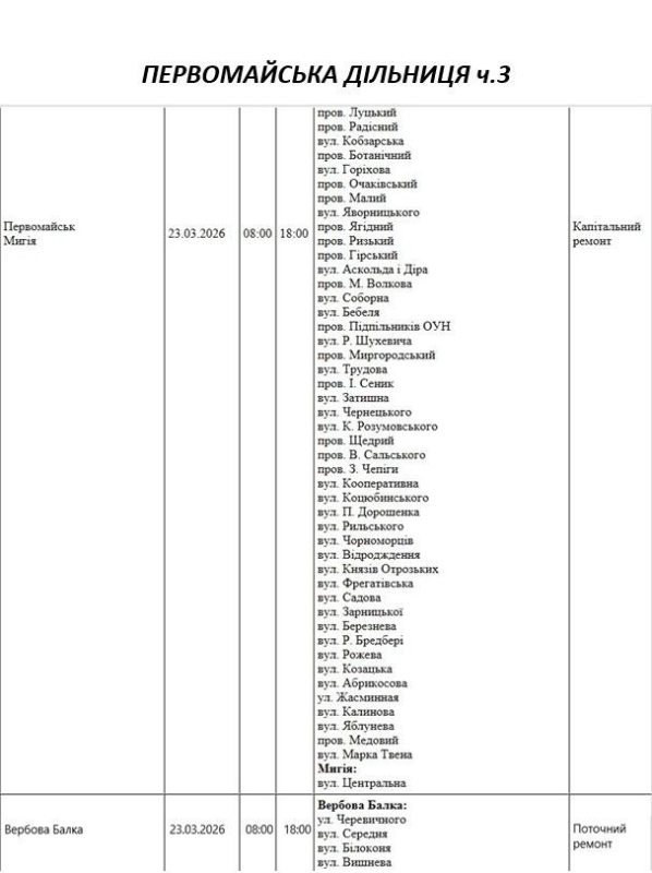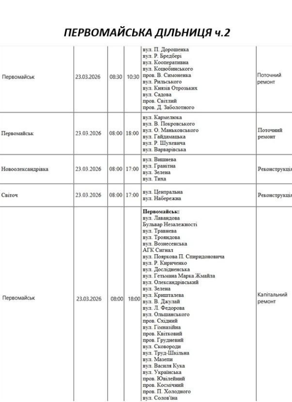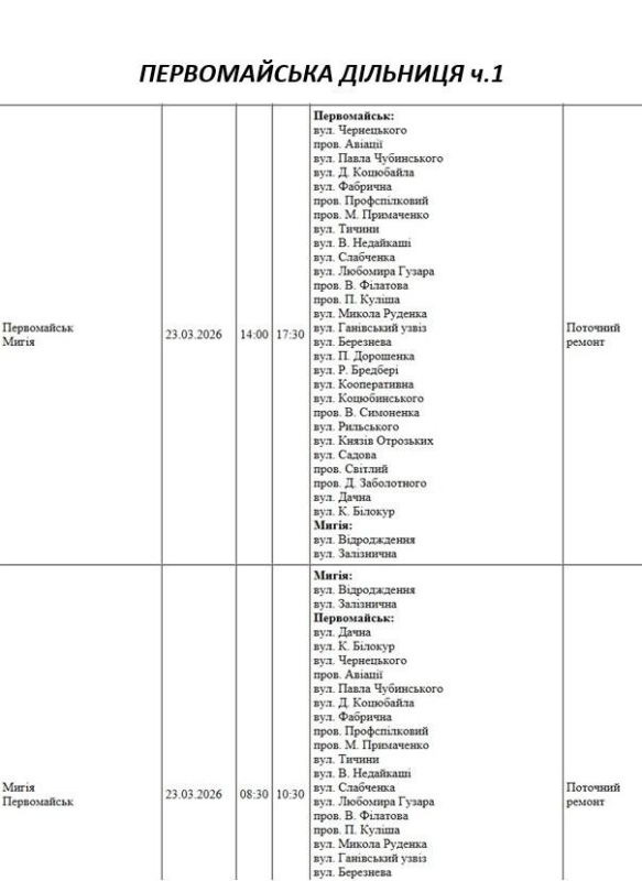 Графік відключення світла по адресах 23 березня, Первомайська дільниця. АТ «Миколаївобленерго»