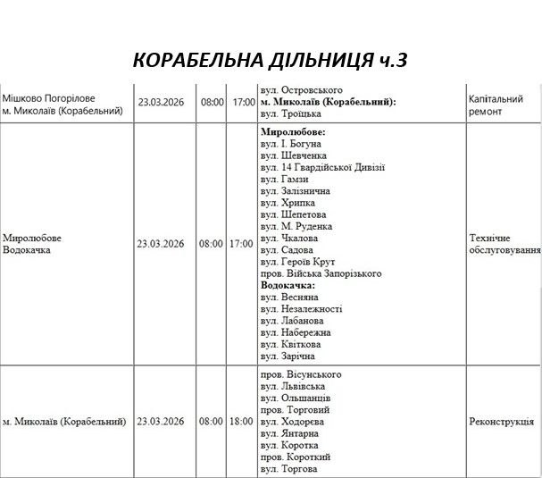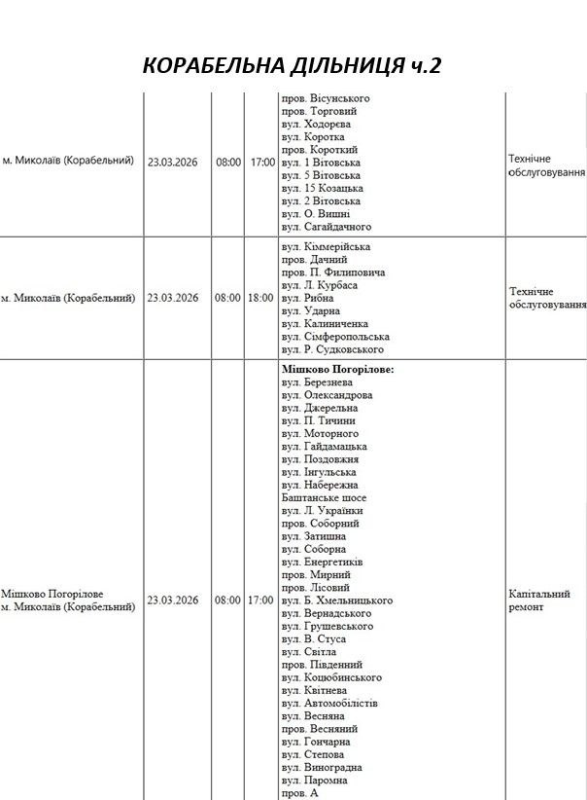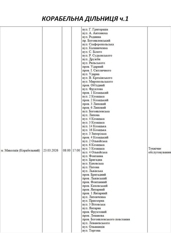Графік відключення світла по адресах 23 березня, Корабельна дільниця. АТ «Миколаївобленерго»