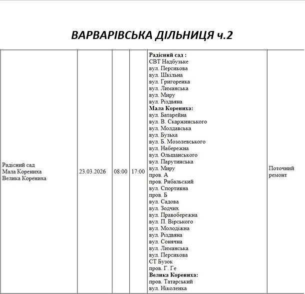 Графік відключення світла по адресах 23 березня, Варварівська дільниця. АТ «Миколаївобленерго»
