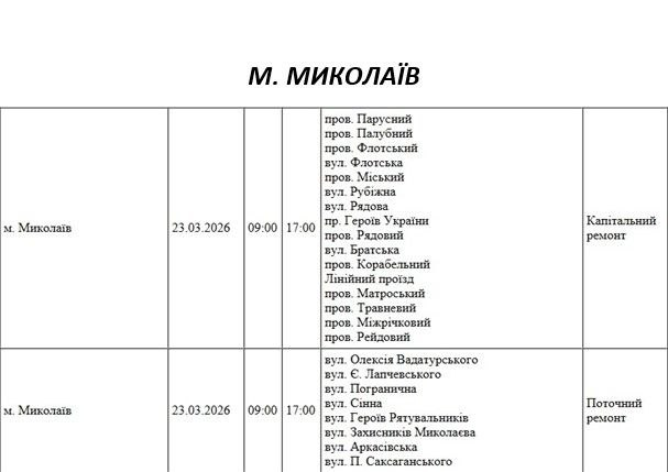 Графік відключення світла по адресах 23 березня, Миколаїв. АТ «Миколаївобленерго»