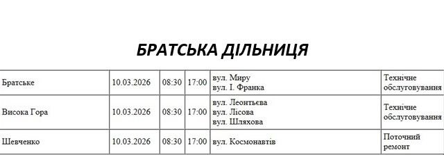 Графік відключення світла по адресах 10 березня, Братська дільниця. АТ «Миколаївобленерго»
