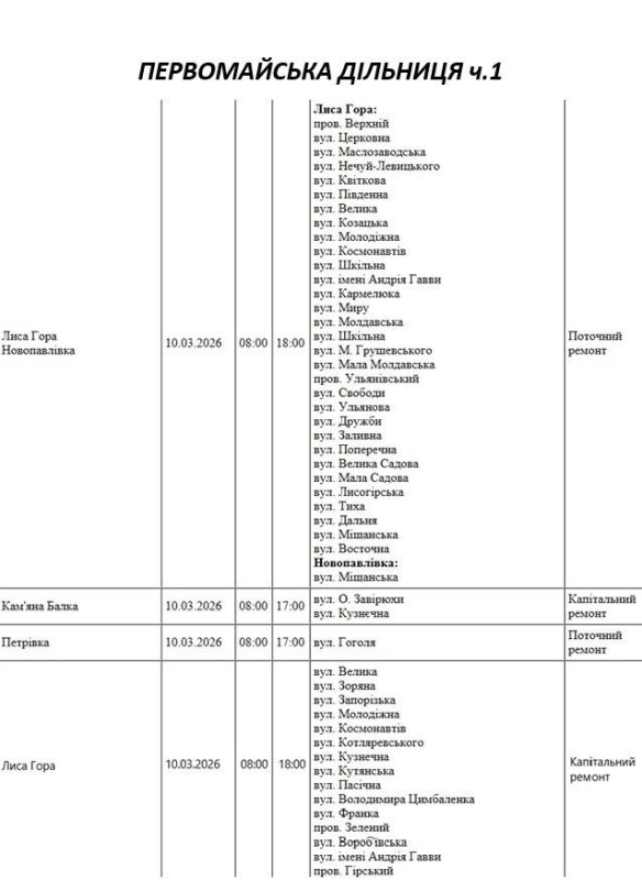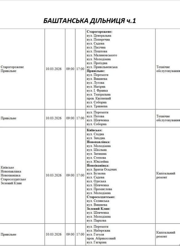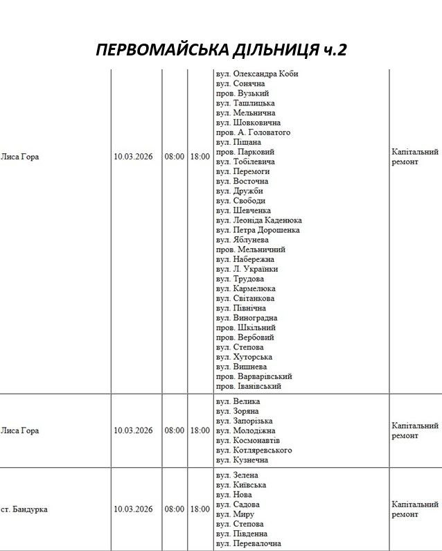 Графік відключення світла по адресах 10 березня, Баштанська дільниця. АТ «Миколаївобленерго» Первомайська дільниця