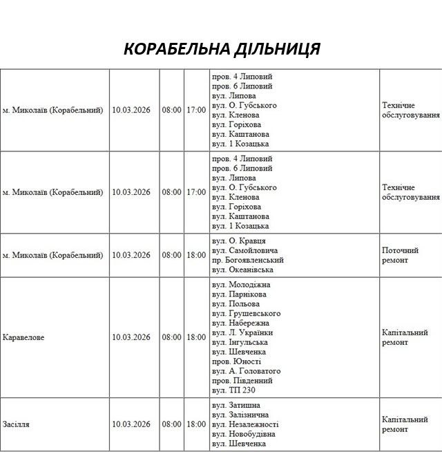 Графік відключення світла по адресах 10 березня, Первомайська дільниця. АТ «Миколаївобленерго» Миколаїв, Корабельна та Варварівська дільниця