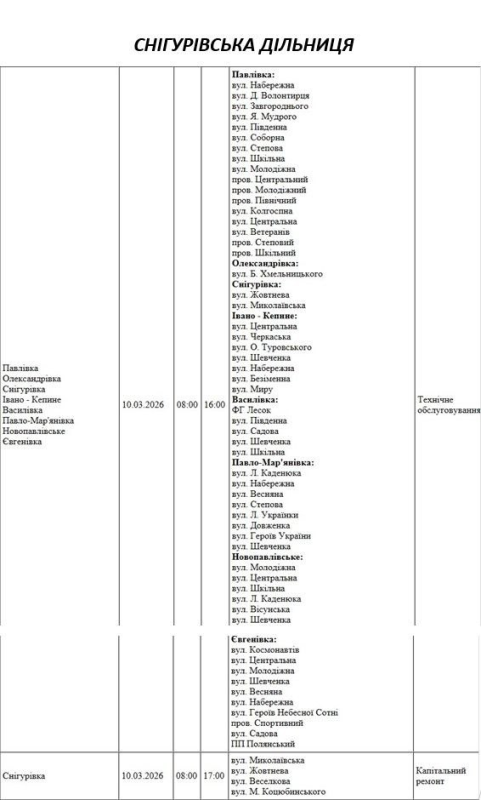 Графік відключення світла по адресах 10 березня, Снігурівська дільниця. АТ «Миколаївобленерго»