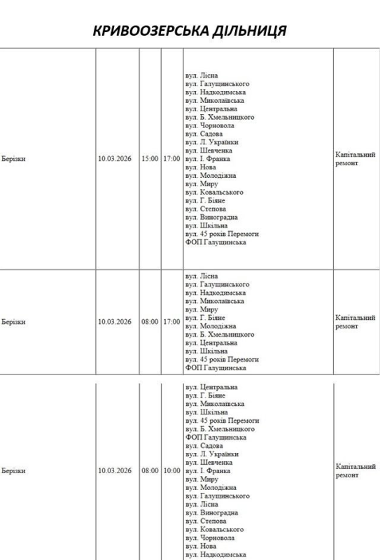 Графік відключення світла по адресах 10 березня, Кривоозерська дільниця. АТ «Миколаївобленерго»