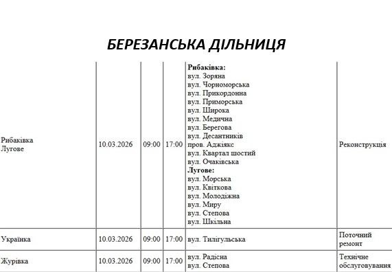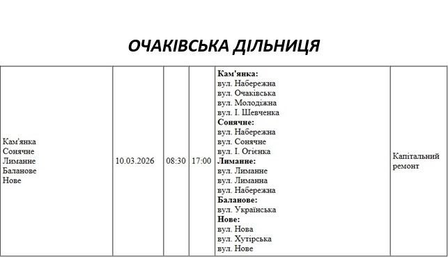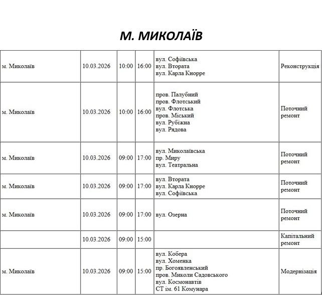 Графік відключення світла по адресах 10 березня, Очаківська дільниця. АТ «Миколаївобленерго»