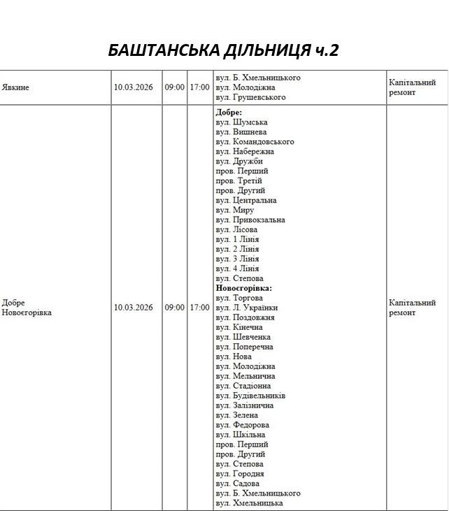 Графік відключення світла по адресах 10 березня, Баштанська дільниця. АТ «Миколаївобленерго»