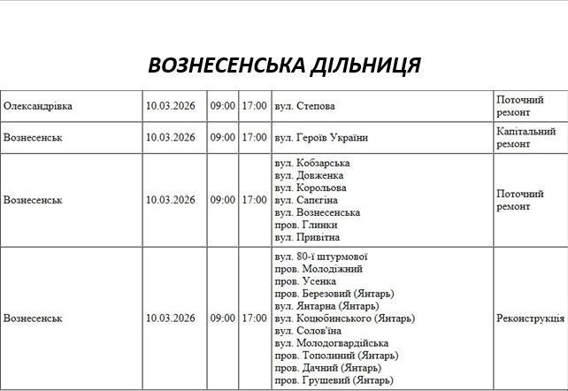 Графік відключення світла по адресах 10 березня, Вознесенська дільниця. АТ «Миколаївобленерго»