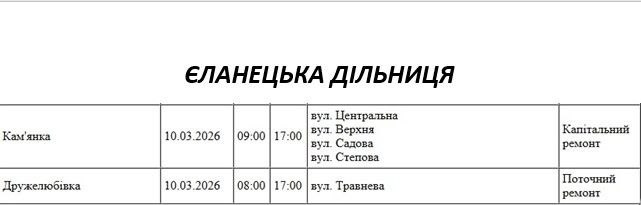 Графік відключення світла по адресах 10 березня, Єланецька дільниця. АТ «Миколаївобленерго»