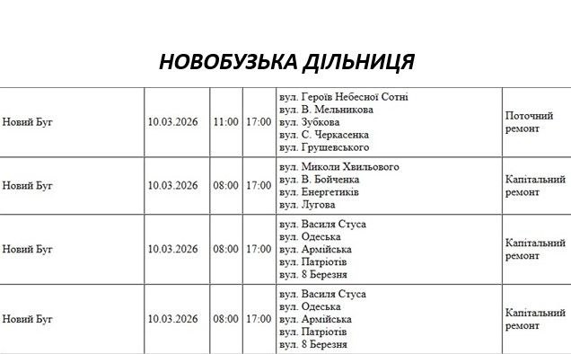 Графік відключення світла по адресах 10 березня, Новобузька дільниця. АТ «Миколаївобленерго»