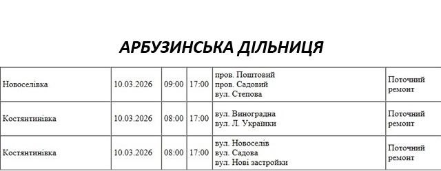 Графік відключення світла по адресах 10 березня, Арбузинська дільниця. АТ «Миколаївобленерго»