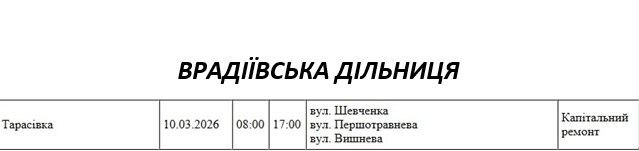 Графік відключення світла по адресах 10 березня, Врадіївська дільниця. АТ «Миколаївобленерго»