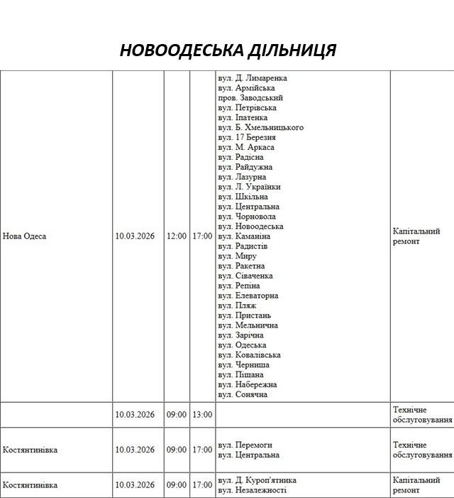 Графік відключення світла по адресах 10 березня, Новоодеська дільниця. АТ «Миколаївобленерго»