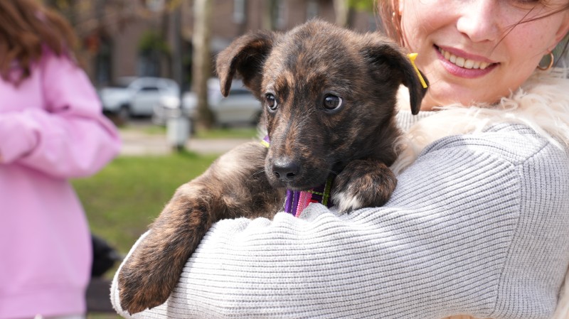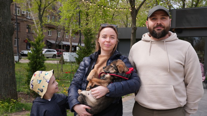 "Емоції переповнюють, все так класно, круто тут організували дівчатка. Песика вирішили взяти, бо треба друг. Треба компанія, охорона треба. Вирішили взяти з Херсона, бо ми самі херсонці", — каже жінка.