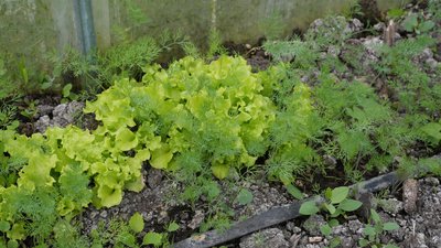 "Кріп розрісся, який у минулому році садив. Бо взагалі він померз, але він ( Олексій — ред.) кинув насіння, і тепер росте по всій оцій половині теплиці. Тут посадив трохи салату, петрушки, розсади помідорів. Редиска була, з’їли на Великдень всю майже" .