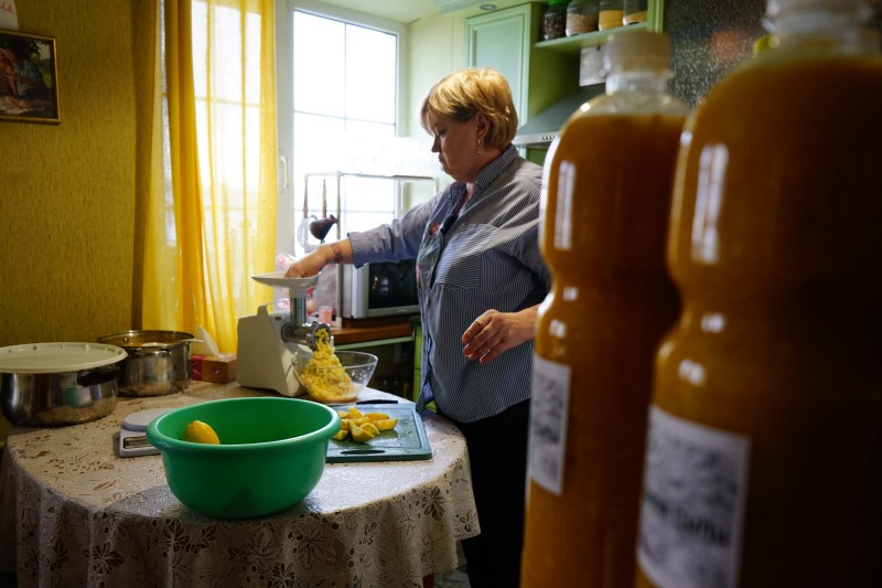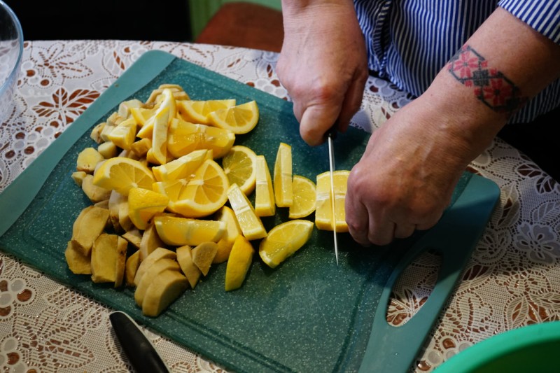 Виробництво "Зілля сили" організоване на кухні. Вимиті лимони та почищений імбир Наталя дрібнить, щоб шматочки влізли в м’ясорубку.