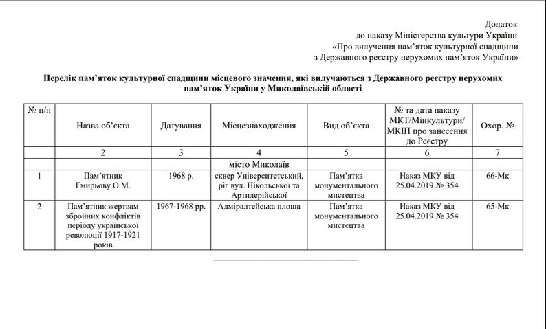 Міністерство культури України 13 березня виключило з Державного реєстру нерухомих пам’яток України два монументи у Миколаєві — пам’ятник Олексію Гмирьову та меморіал, відомий як “Пам’ятник борцям за владу Рад”. Відтепер обидва об’єкти не мають охоронного статусу пам’яток культурної спадщини.