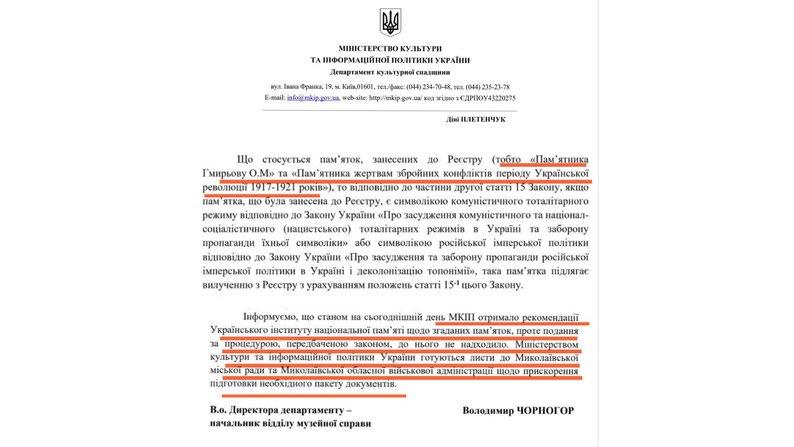 У листі також йшлося, що Мінкульт знову отримав рекомендації Українського інституту національної пам’яті щодо цих пам’ятників, однак необхідний пакет документів від уповноважених органів тривалий час не надходив. Детальніше про ситуацію Суспільне Миколаїв писало раніше.