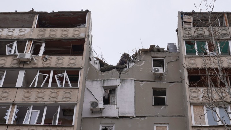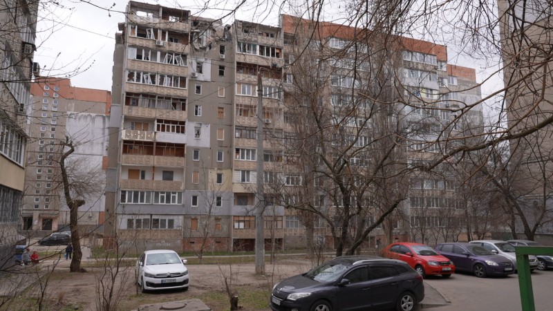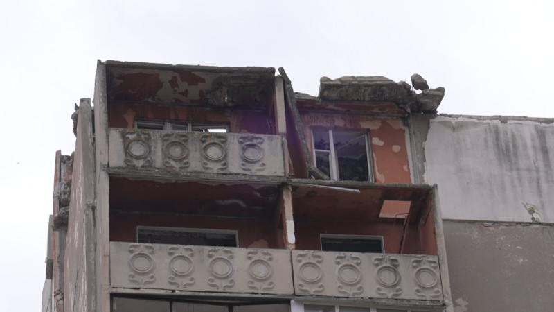 Пошкоджена секція будинку: провалений верхній поверх, знищені балкони, вибиті вікна. Суспільне Миколаїв/Богдана Будулуца