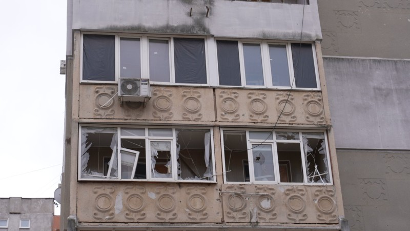 Пошкоджені балкони та вікна багатоповерхового будинку — скло вибите вибуховою хвилею, рами перекошені. Суспільне Миколаїв/Богдана Будулуца