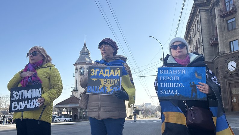 Традиційно миколаївці вшанували загиблих українських воїнів та цивільних хвилиною мовчання в центрі міста. О 09:00 вони зібралися зі світлинами своїх полеглих рідних та друзів.