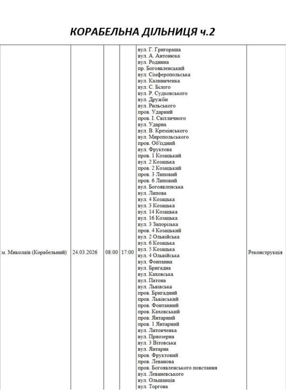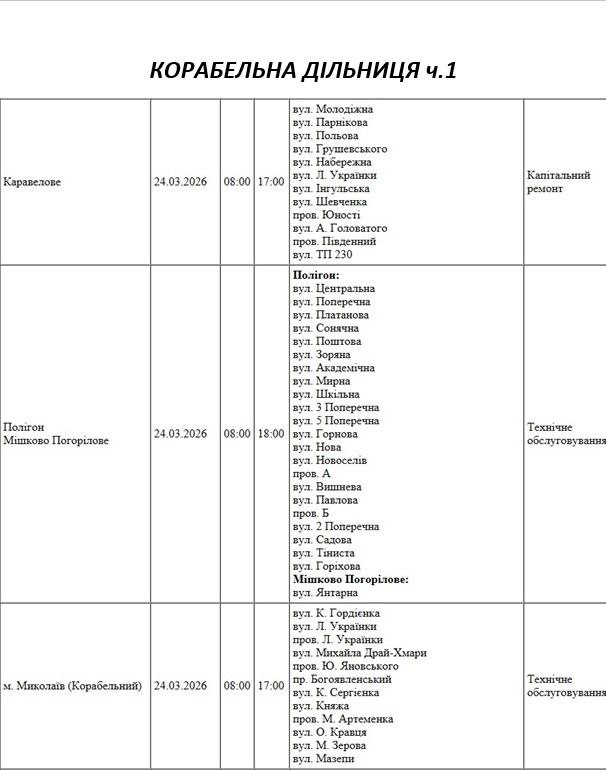 На Миколаївщині 24 березня деякі вулиці залишаться без електропостачання. Це пов'язано із поточними ремонтними роботами, реконструкціями та технічним обслуговуванням.
