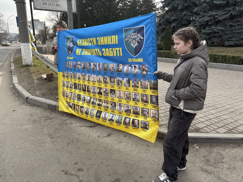 "Женя зник ще на початку війни, коли були бої на заводі Ілліча. Нічого про нього невідомо, але я прихожу на акції, сподіваюсь, що хтось побачить, впізнає", — каже жінка.