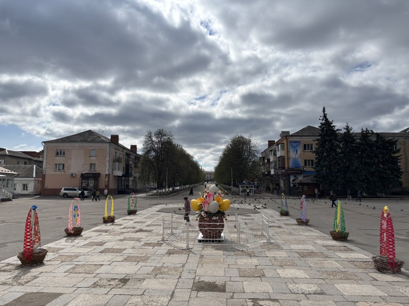 У Первомайську, що на Миколаївщині, на центральній площі ім. Тараса Шевченка напередодні Великодня, місцеві юні дизайнери створили композицію та провели конкурс-виставку "Дивограй до Великодня-2026".