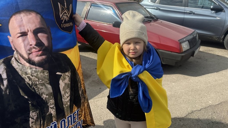 Місцева жителька Аліна чекає на свого брата Олега та батька Сергія. Сьогодні на акцію вона прийшла з донькою Домінікою.