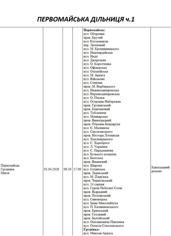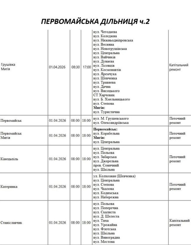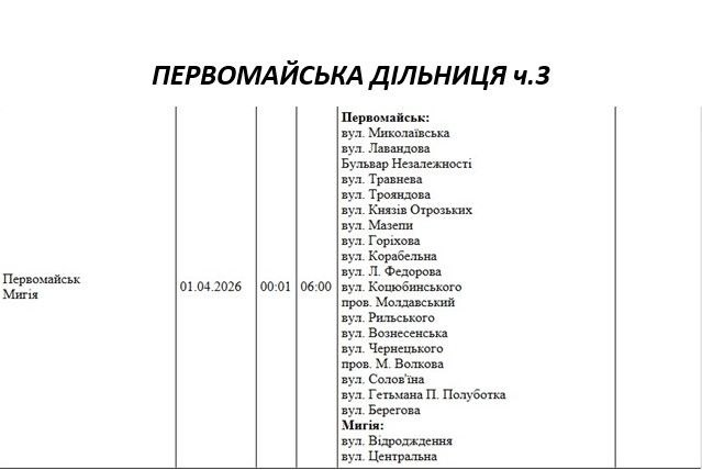 Графік на 1 квітня, Первомайська дільниця АТ «Миколаївобленерго» Інші дільниці регіону