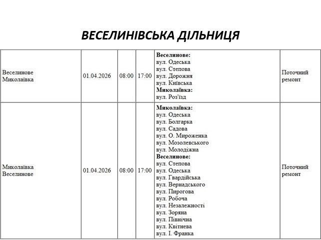 Графік на 1 квітня, Веселинівська дільниця АТ «Миколаївобленерго»