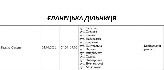 Графік на 1 квітня, Єланецька дільниця АТ «Миколаївобленерго»